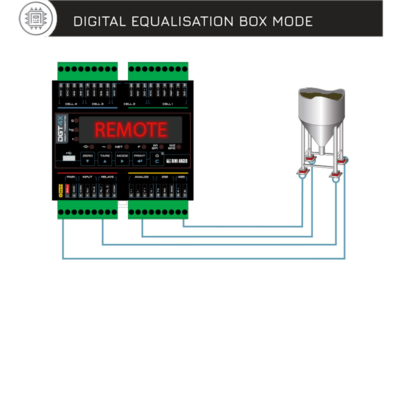 Power supply: 12-24Vdc Converter: A/D 24 bit with 4 channel Max scale number: 4 Load cells connection: 4 or 6 wires (with sense) Operating modes: - Digital junction box - Multi-scale transmitter - Single-scale transmitter
